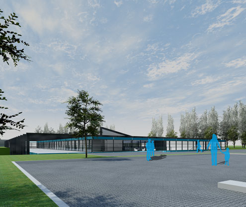 Wichtig für meinen Entwurf war es einen möglichst niedrigen Baukörper zu entwerfen. Es sollte möglichst keine Höhenversprünge in der Dachfläche geben, damit die Raumhöhe in der Schwimmhalle überall gleich ist. Der Baukörper ist zur Hälfte in den Boden eingelassen. Die obere Hälfte ist komplett verglast um eine natürliche Belichtung des Schwimmbades zu erlangen. Das Wettkampfbecken ist so angeordnet, dass es nur West und Nordlicht erhält, somit werden die Sportler nicht von der Sonne beeinträchtigt.
